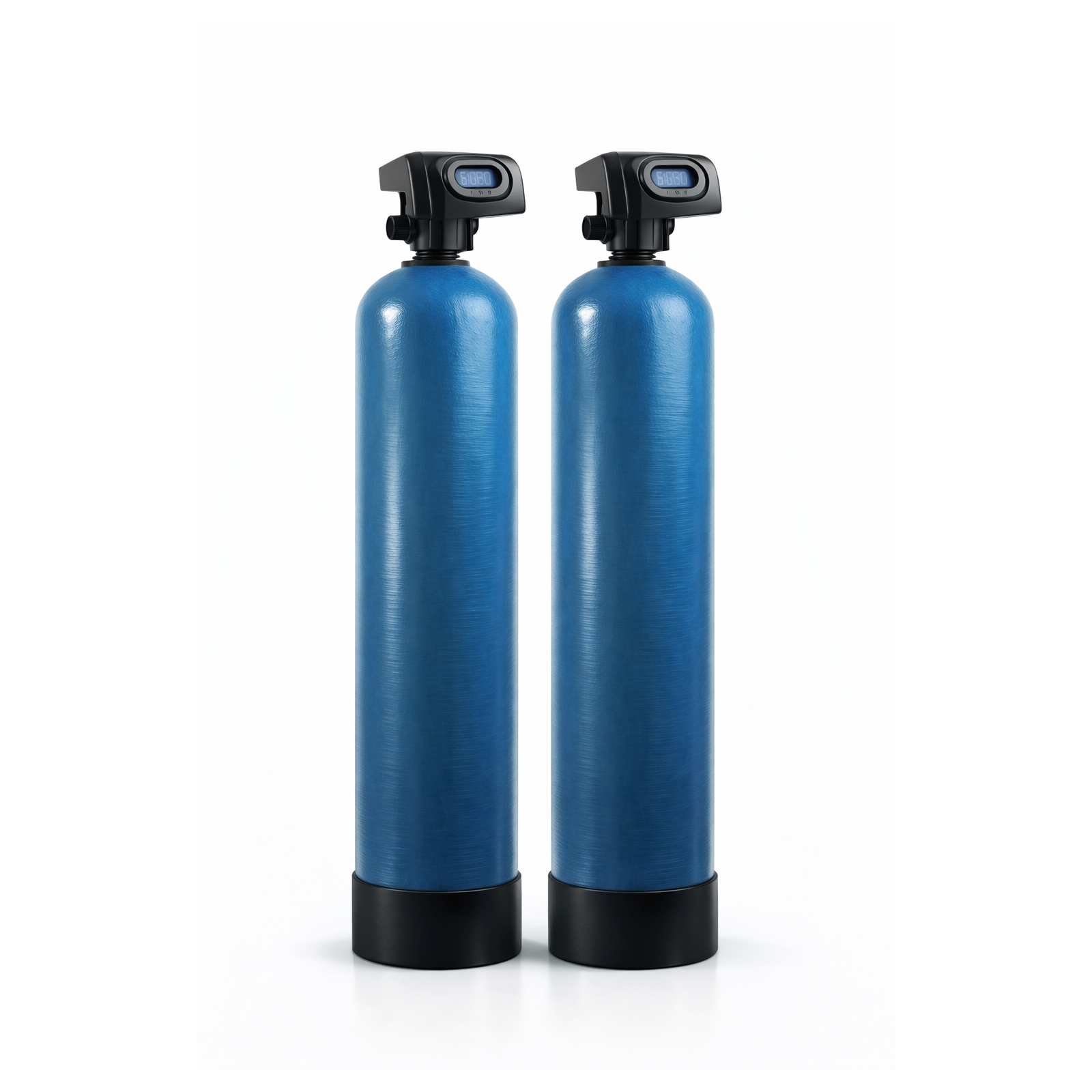 Les plus gros modèles Duplex fonctionnent avec 2 vannes branchées en parallèle afin d'optimiser le débit en utilisant les 2 bonbonnes en même temps lorsqu'aucune des 2 ne régénère sa résine. Les 2 vannes sont connectées par un câble interlock fourni afin de s'assurer qu'elles ne régénèrent jamais en même temps.
