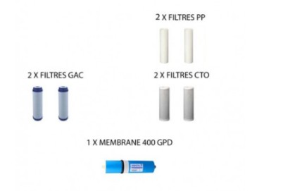 2 à 3 ans d'entretien : - 2 x filtres PP (10 pouces) - 2 x filtres GAC (10 pouces) - 2 x filtres CTO (10 pouces) - 1 x membrane 400GPD |
