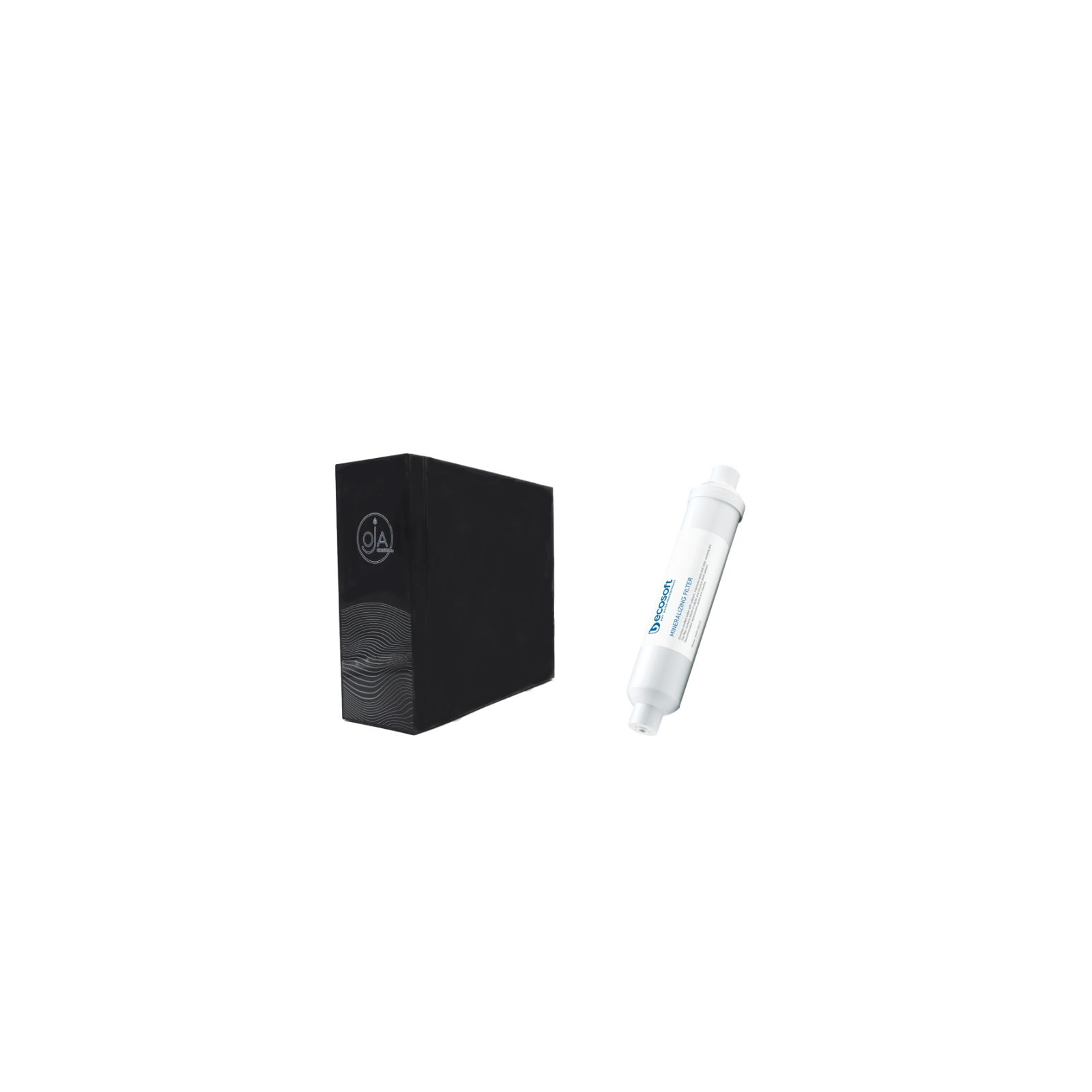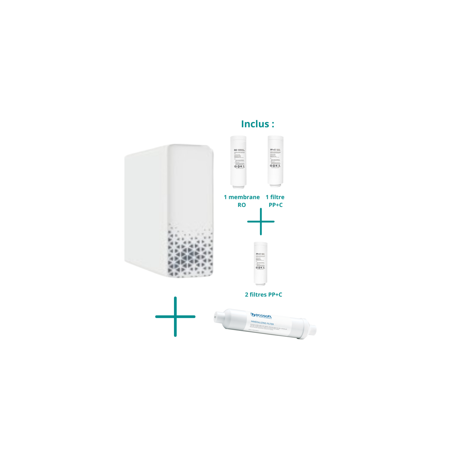 Le processus de filtration de l’osmoseur Optimos s’effectue en deux étapes : une première cartouche de préfiltration (filtre polypropylène + charbon actif) et une membrane d’osmose inverse haute performance.